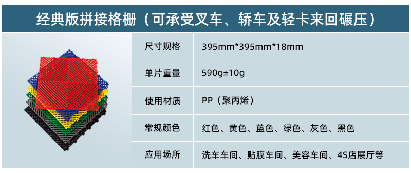多功能拼接格柵具有高強承載、防水防油、色彩絢麗、施工簡便、防水防污、無臭無毒等諸多優(yōu)點,廣泛應用于家庭陽臺、汽車美容快修店、汽車4S店、洗浴中心、公共衛(wèi)生間、展覽展會、賓館酒店過道等場所。